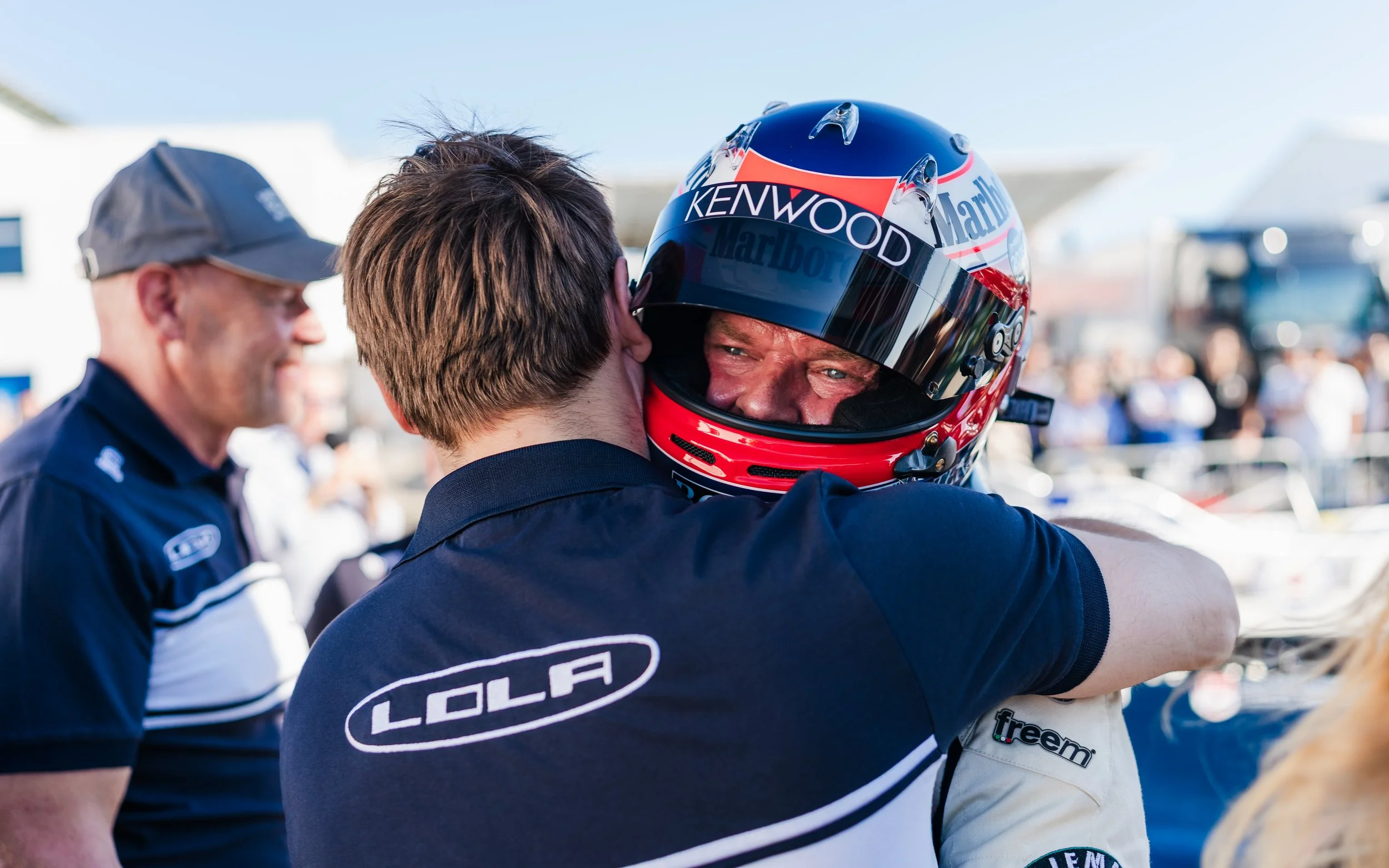 A racing team member leaning over a race car during a racing event on a sunny day, with people and flags in the background. Lola T70 MkIIIB Peter Auto Estoril Classic 2025. Legacy Outlaws Racing Team.